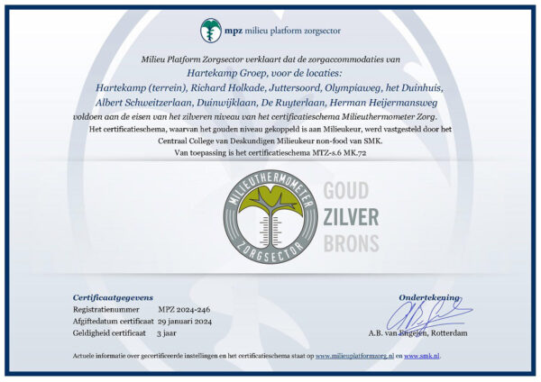 De Hartekamp Groep heeft voor negen locaties het zilveren certificaat van het Milieu Platform Zorg. Dit betekent dat onze organisatie het afgelopen jaar flinke stappen heeft gezet op het gebied van milieu en duurzaamheid.